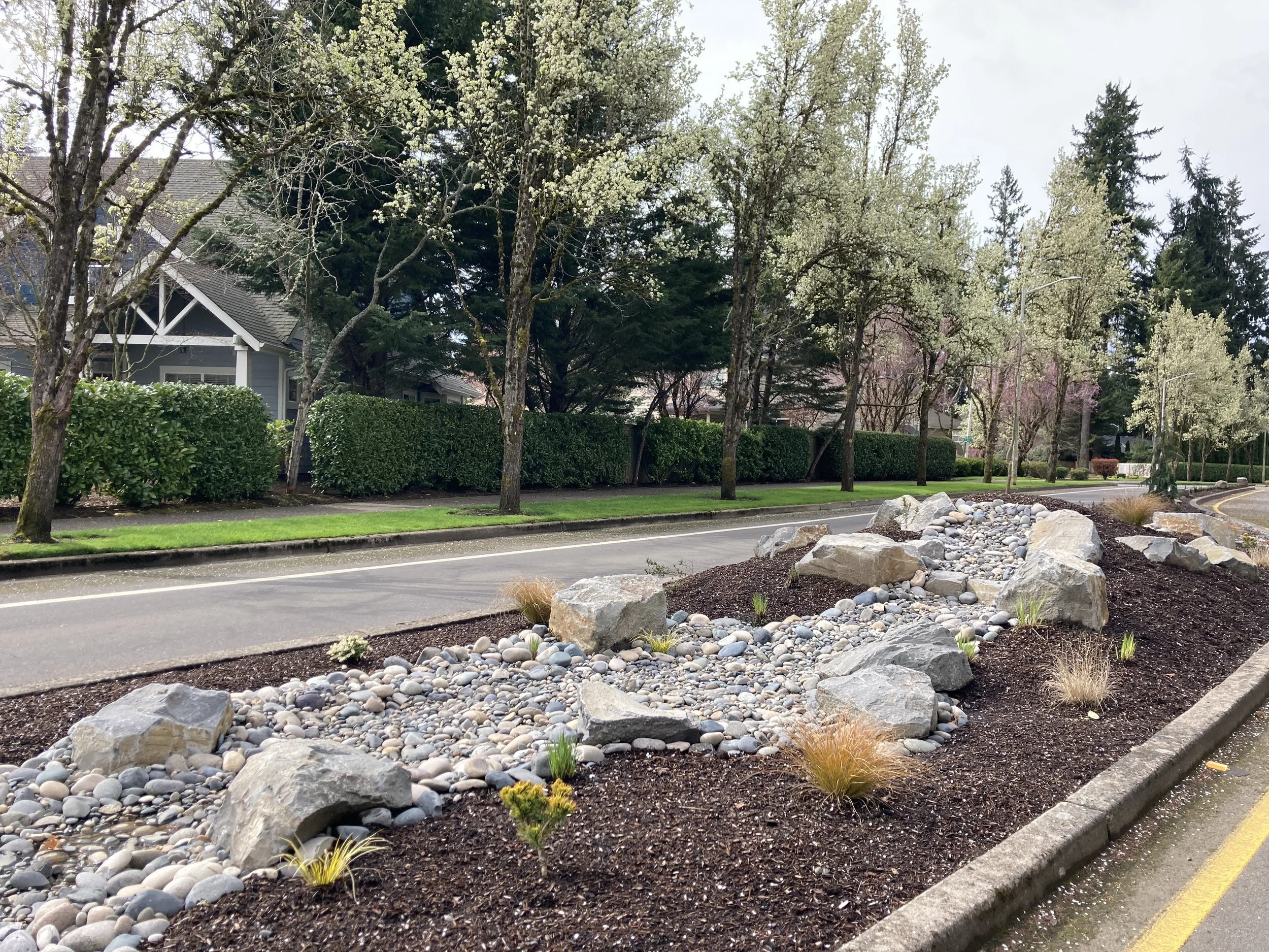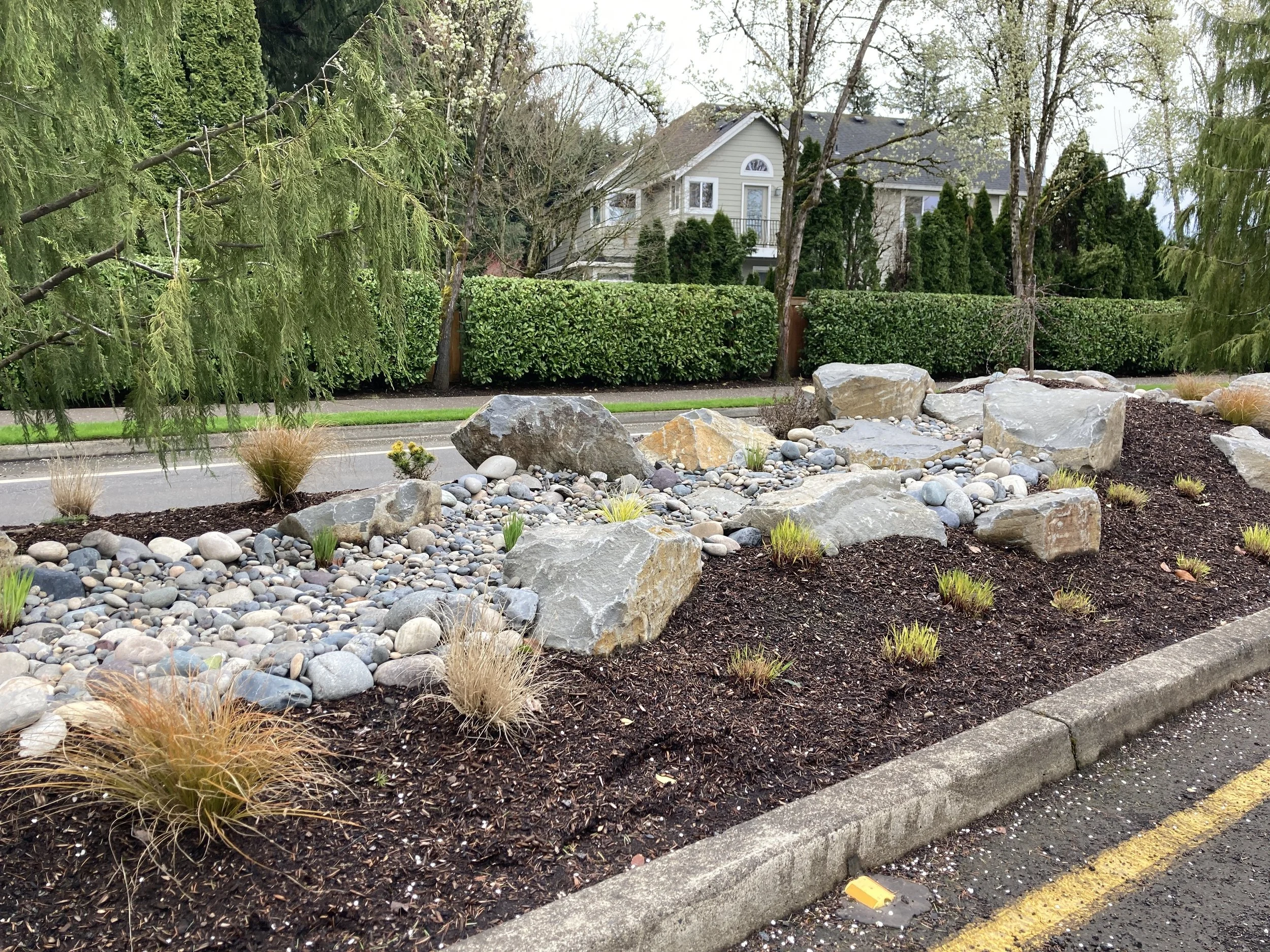 Another project that came to me by way of my partnership with Boulder Falls, the HOA for this upscale subdivision wanted to improve the visual impact of their outdated medians while keeping costs down. We settled on a design that simulated natural creekbeds (expertly brought to life by the crews at BF—what a difference good execution makes!) and took advantage of negative space and repetition with four seasons of interest. The strategic use of boulders symbolizes the neighborhood's permanence, evoking a sense of stability and timelessness. These gardens have much lower water and maintenance requirements and will stay low, improving sight-lines and traffic safety for the residents. I was invited back to redesign their grand entrance—stay tuned for pictures of that dramatic renovation to come!